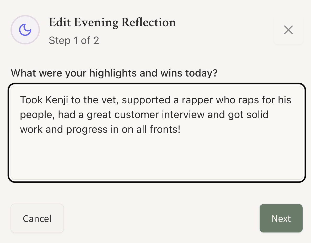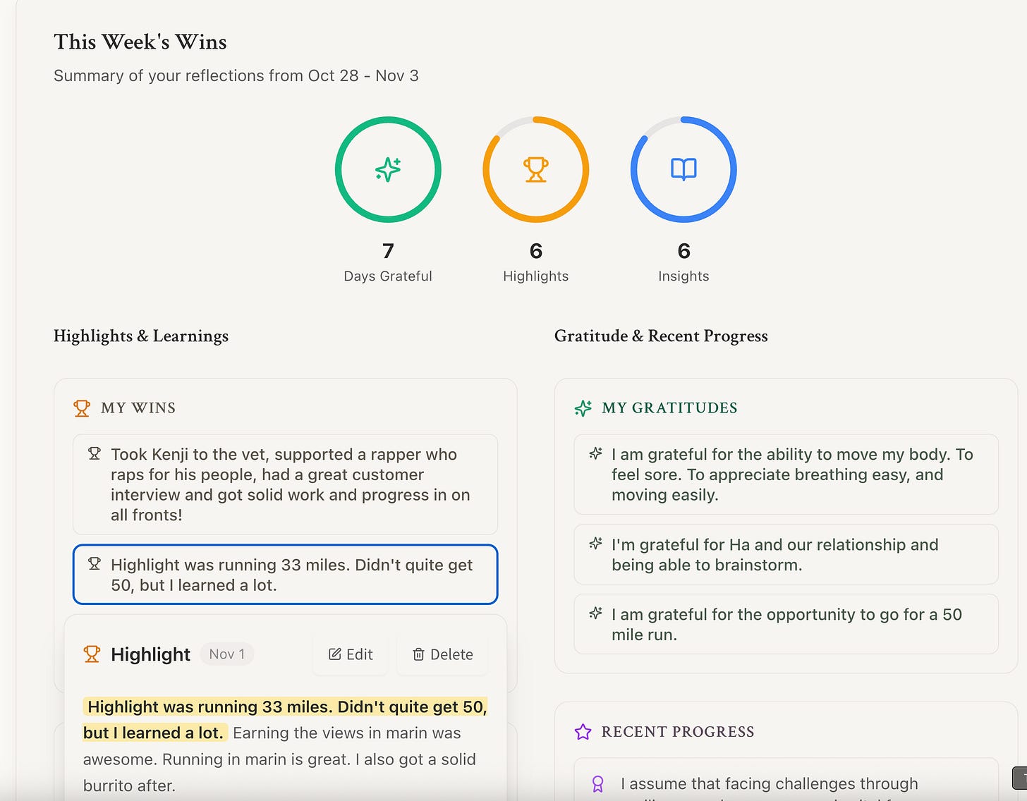 The Wins dashboard shows you your recent journals and highlighted experiences that are very aligned towards your best self.