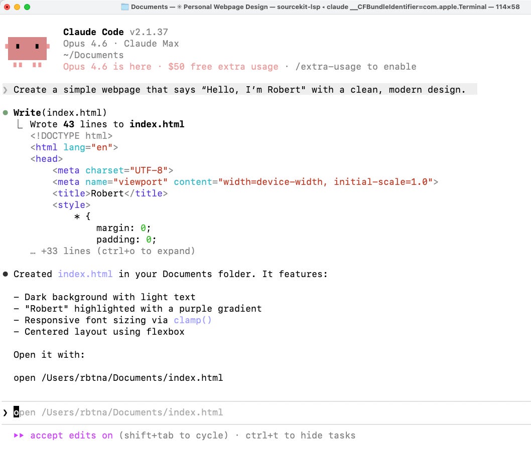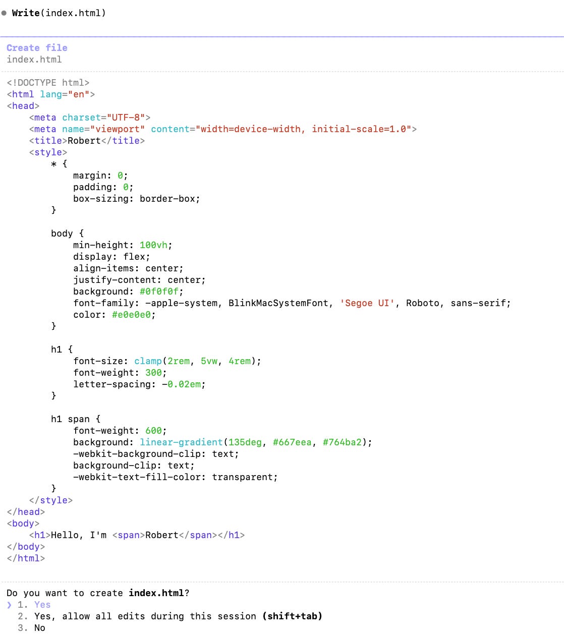 Create a simple webpage that says “Hello, I’m [your name]” with a clean, modern design. Watch what happens.