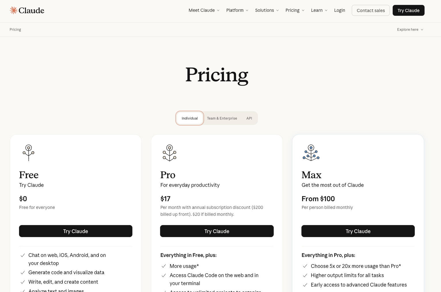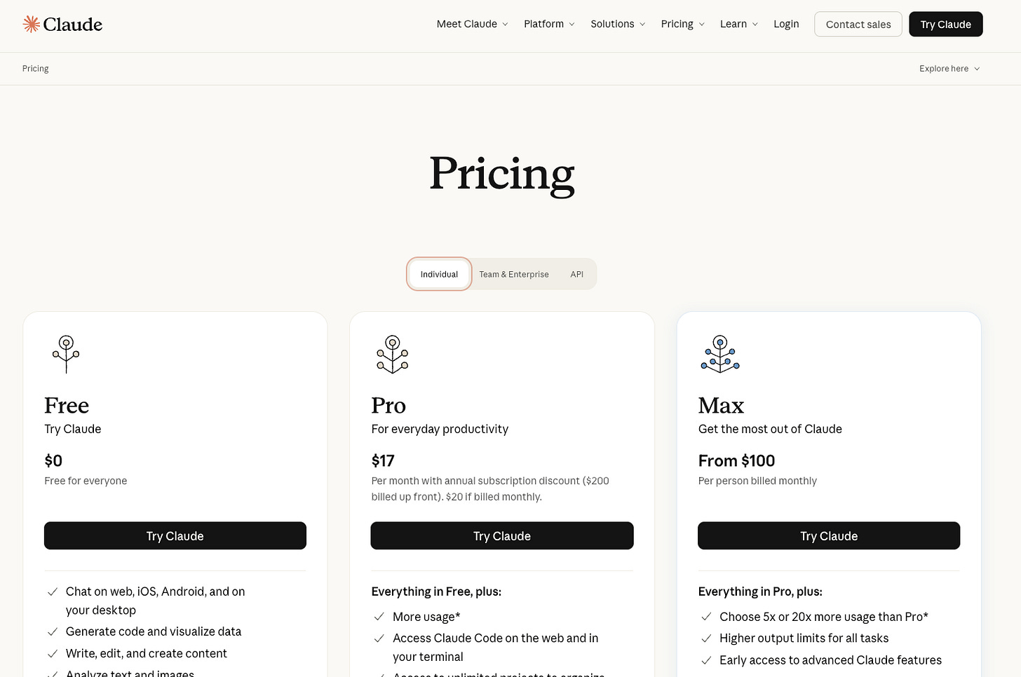 $20/month if you pay monthly, $17/month if you pay annual at claude.ai.