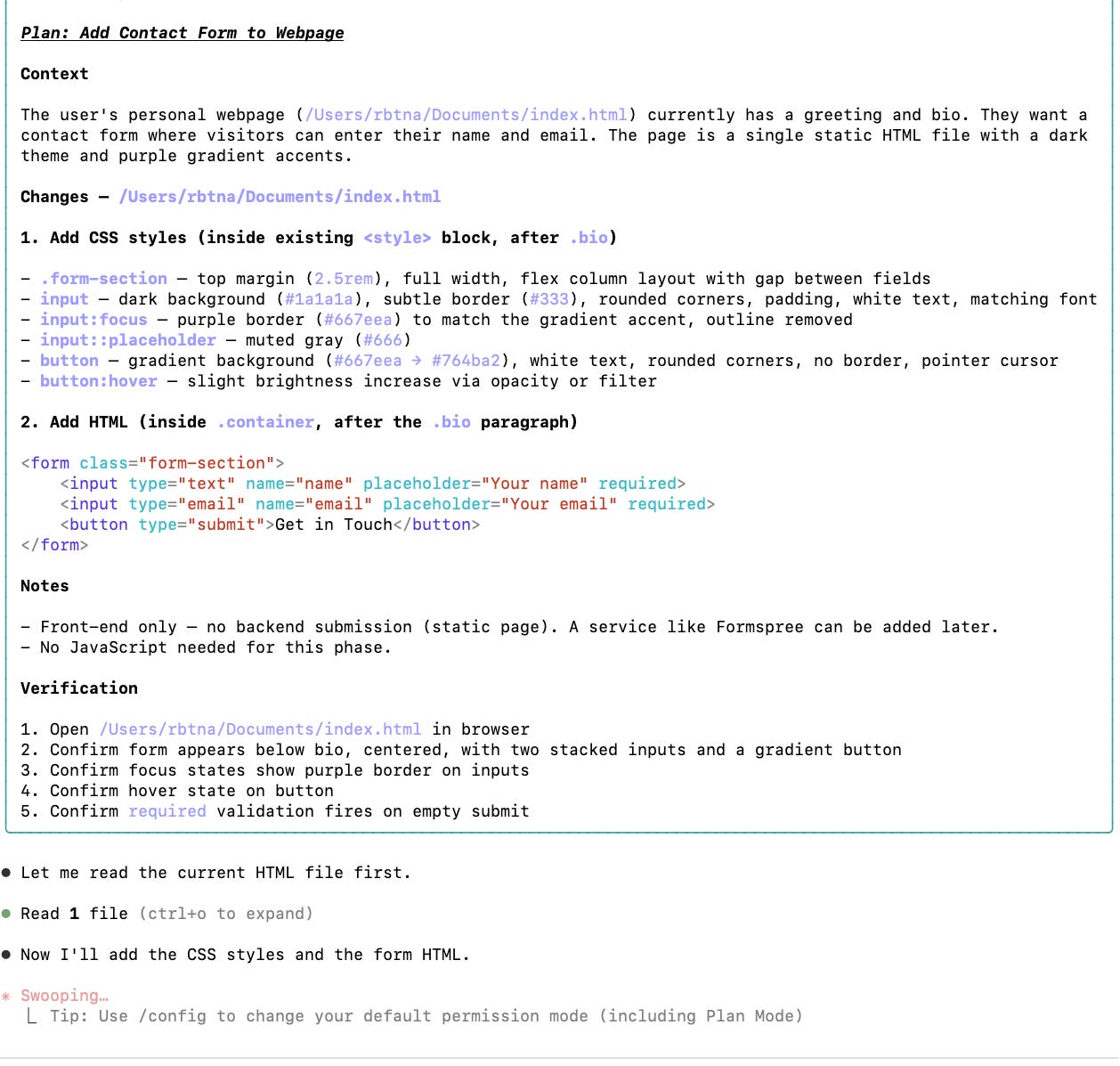 I want to add a contact form to my webpage where visitors can enter their name and email. Show me your plan first.Claude will lay out exactly what it intends to do. Which files it’ll create. What code it’ll add. Why.