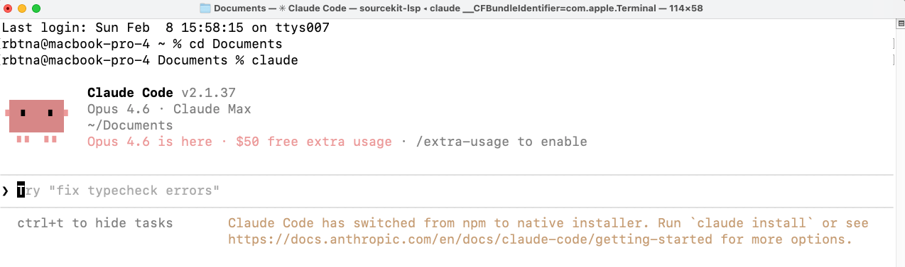 Now you’re in Claude Code, inside a project (Documents, if you followed the above) folder.