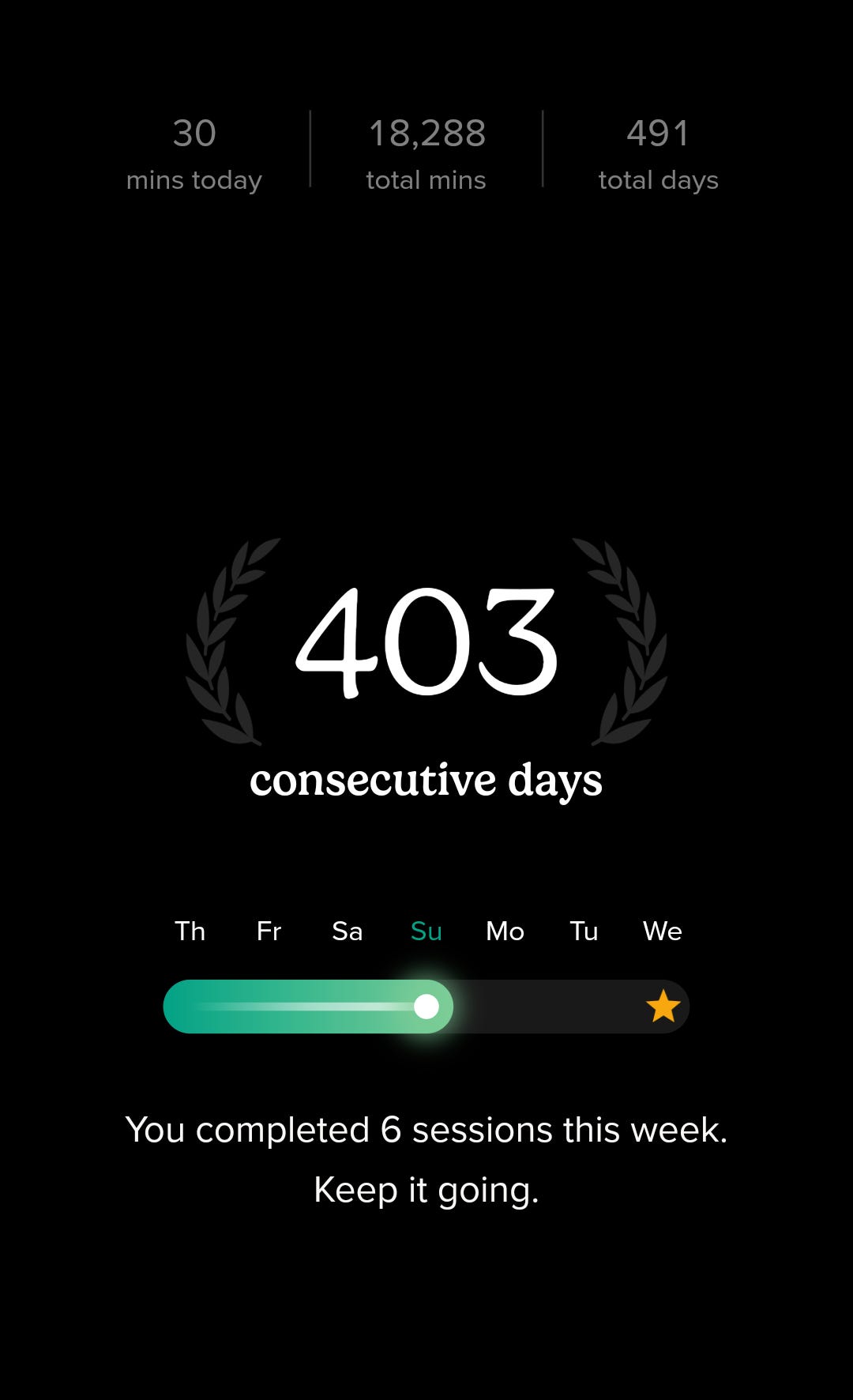 I’m at 403 days of meditating at least 30 minutes daily, to sharpen my emotional regulation and focus skills.